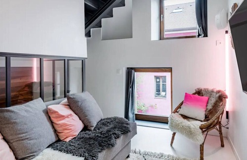 Comfortable private home in the heart of Annecy, next to the lake. Contrast between the historic 15th-century exterior, near the château, and the cosy contemporary style of the interior. Multi-level articulation of contemporary lines and noble materials, such as wood, steel, white concrete and workshop partitions.