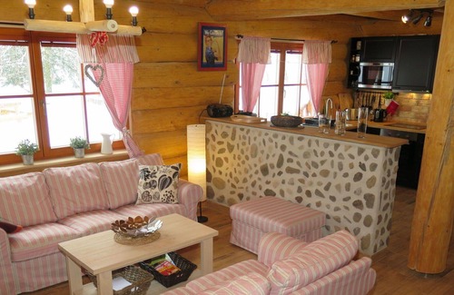 Chalet de madera 5 habitaciones 280 m2 en 2 plantas. Espacioso, abuhardillado, con mobiliario confortable y de buen gusto: entrada. Habitación de paso. Salón-comedor grande con 2 sofás-cama, chiminea nórdica, TV satélite, pantalla plana, radio, CD y DVD. Salida al balcón acristalado. 1 dorm. con 2 camas. Cocina abierta (horno, lavavajillas, 4 placas de vitrocerámica, tostadora, hervidor de agua eléctrico, microondas, congelador, grill, cafetera eléctrica, olla a vapor) con barra americana, mesa de comedor. Ducha/WC, bidet. Planta superior: sala de estar, abuhardillado con radio y CD. 2 dorm., abuhardillados, cada habitación con 3 camas, TV satélite y pantalla plana. 1 dorm., abuhardillado con 2 camas-nido (2 pers.), TV satélite (pantalla plana). Ducha/WC, doble lavabo. Calefacción eléctrica. A tener en cuenta: 2 mascotas / perros. Detector de humo, extintores.