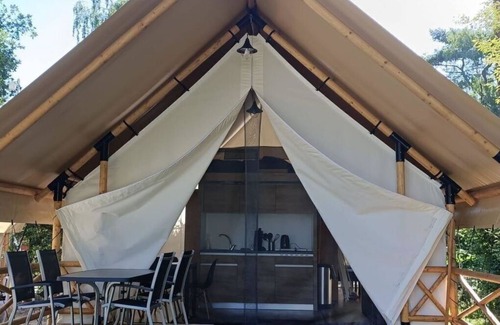 "Glampingtent 4", estudio mobile home. Con mobiliario funcional y agradable: salón-comedor abierto con mesa de comedor y TV. Salida a la terraza. 1 dorm abierto con cortina con 1 cama doble. Cocina abierta (2 fogones, hervidor de agua eléctrico, cafetera eléctrica). Ducha/WC. Aire acondicionado. Planta superior: (escala) altillo abuhardillado, abierto, altura de techo 30 - 80 cm con 2 posibilidades para dormir. Terraza pequeña, jardín pequeño. Muebles de terraza. El alojamiento dispone de: trona, cuna (extra). Internet (Wifi, gratis). Plaza de aparcamiento (1 coche). A tener en cuenta: apartamento para no fumadores. Esto es una tienda de glamping. Solo se aceptan reservas para vacaciones. Se puede cargar un depóstio de 100 EUR por persona en destino. En lugar de un dormitorio cerrado, algunos espacios para dormir están situados en una zona diáfana (galería, alcoba, etc.).