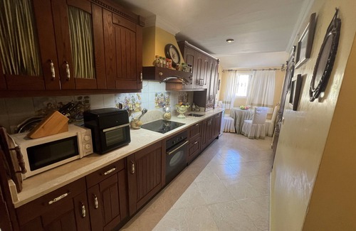 La cocina independiente, eléctrica, está equipada con nevera, microondas, horno, congelador, lavavajillas, vajilla/cubertería, cafetera y tostadora.