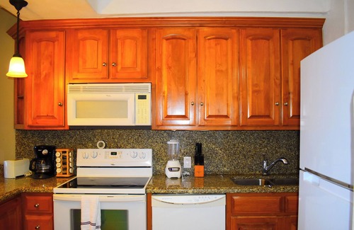 Te alegrará la espaciosa cocina llena de luz natural y encimeras de granito. Muchos gabinetes llenos de muchos platos y cubiertos, un microondas, una licuadora, una cafetera, una tostadora, una nevera completa, un lavavajillas y un horno / estufa significan que puede cocinar todas las comidas del condominio si lo desea.