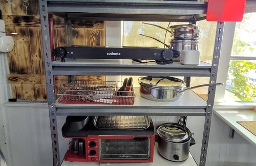 Este autobús se transformó en 2021, dándole un estilo moderno lleno de encanto y comodidad. Está equipado con calefacción eléctrica y 2 unidades de aire acondicionado de ventana. La ducha tiene una varilla de mano y un calentador de agua sin tanque para obtener agua caliente al instante. Un tocador incorporado, secador de cabello provisto, artículos de papel de primera calidad, colgadores de ropa, electrodomésticos, Keurig y una variedad de sabores, azúcar y crema, junto con aceite y especias, además de sábanas y almohadas adicionales, ¡realmente sellan el trato!