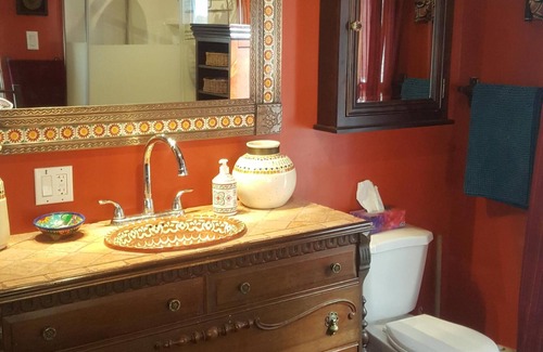 Nuestra casita funky está decorada en atrevidos colores mexicanos, amueblada principalmente con antigüedades y sus paredes están decoradas con artefactos de todo el mundo.