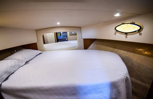 Step aboard your private oasis, a spacious 40-ft yacht that comfortably sleeps 6 . The interior exudes elegance and comfort, featuring a well-appointed cabin with cozy sleeping quarters, a fully equipped kitchenette, and a stylish lounge area.