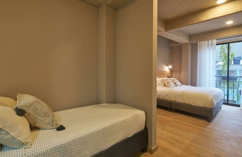 The apartment has one queen bed and one single bed. contemporary decor, good natural light, and a cozy ambiance. Ideal for one or two guests. Functional layout with a desk, TV, private bathroom, and rest area — all in a quiet setting within the building.