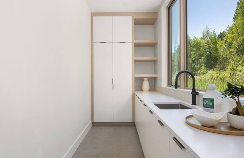 This modern home is built with breathtaking architecture and paramount views. With a central location but private surroundings you have both the luxury of an oasis and convenience of the city. With the lake on one side and a pond on the other there is no shortage of unprecedented views, wildlife, and recreation. You can watch the sunset from the hot tub, be entertained by the eagles and otters, or curl up on the couch with the a/c and TV as you take in the ridgeline over the water.