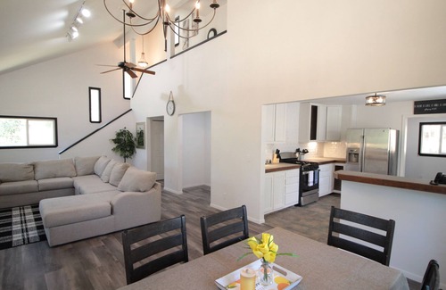 1600 sq foot home with high ceilings gives ample room for you and your family. A meandering creek flows through the property in the wet season and is a welcomed sound heard from the balcony. Both bedrooms are equipped with new Sealy queen memory foam beds. New bed frames and 50-inch smart tv's to enjoy your favorite streaming apps. Master bedroom sets a relaxing mood with the new Sierra Dimplex Electric fireplace. (Can be used without heat mode) Entertain your guest in the living room with high ceilings and framed high windows outlooking an array of trees and large rocks. 60-inch tv resides in living room for movies or games. A large sectional couch greets you as you enter the front door from the balcony entrance. Stainless steel appliances in the kitchen and a wine fridge to keep your bottles at the perfect temperature. evaporative cooling system vented throughout the home keeps you cool in summer months.