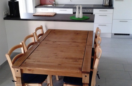 Estufa (vitrocerámica) con cuatro platos, horno, heladera con freezer, microondas, cafetera, tetera, tostadora, diversos utensilios de cocina, como ollas, sartenes, vajilla y cubertería para 12 personas (tazas, platos planos, platos hondos, tartas, postres, ensaladeras, Gafas, etc.) y un lavavajillas, por supuesto, está disponible!
