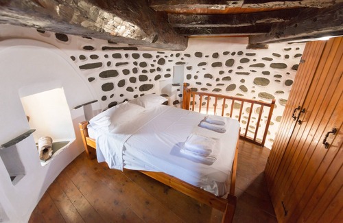Una original escalera de piedra conecta las habitaciones. No hay puertas ni separación entre las habitaciones, en lugar del hecho de que cada una está en un piso diferente.