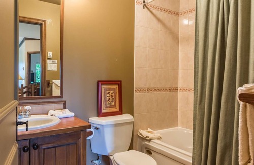 A cute, welcoming condo with two bedrooms and two bathrooms. You'll be charmed by the cozy, country-inspired décor and the generous window arrangement that lets in light and a beautiful view of nature. The main area includes the well-equipped and functional kitchen, the comfortable living room with wood-burning fireplace and a round dining room table. The master suite is furnished with a queen-size bed, cable TV and full bathroom with heated floor. The unit is equipped with wireless access to high-speed internet, three cable TVs, a DVD player and compact music player. A ski locker is available to the occupants. Winter or summer, you can be sure you've chosen the right place to stay!