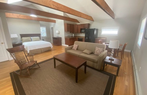 El apartamento tipo estudio sobre el garaje, con entrada propia, cuenta con sofá cama, cama queen, cocina completa y baño. También tiene un televisor de pantalla plana de 55 pulgadas y aire acondicionado.