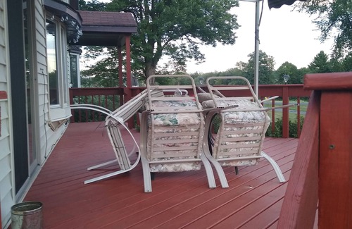 nivel superior tiene una sala de estar con TV, cama de día con cama nido y dos bonitas sillas y un escritorio, segundo baño completo también tiene ducha. Gran pasillo a otras habitaciones la primera habitación tiene una cama queen y una cómoda y un armario grandes, la segunda habitación tiene dos camas individuales con un gran armario y una cómoda, hay una terraza de la vieja escuela para una mesita de noche. Salga por la puerta en verano y estará en "Maple Hills Golf Course". Salga en invierno al sendero Groomed Snowmobile al otro lado de la carretera, puede recorrer millas y millas. Si te gusta jugar en el Casino, estás a solo 4. 4 millas de Ho-Chunk Gaming. La mundialmente famosa compañía de carne ahumada Applewood de NUESKE está a solo 2, 8 millas más adelante. The Walls of Wittenberg es una visita obligada, el arte es excepcional, hay una página web WOW a la que puedes ir para ver los próximos eventos. (www. wallsofwittenberg. com) Rachel's Roadside Bar and Grill está a 0. 4 millas por la carretera. Ella tiene una excelente pizza y más. Si está buscando un gran lugar para llevar a la familia a rodar la bola de boliche, diríjase a Resch Lanes en Wittenberg, a solo 2,8 millas más adelante. No te pierdas el Museo de Wittenberg a unas pocas cuadras más. La gente es muy amable y te guiará a cualquier lugar, así que pregúntale a alguien si no puedes encontrar lo que buscas. El restaurante familiar Wittenberg es un excelente lugar para salir a comer. El personal es amable y edificante.