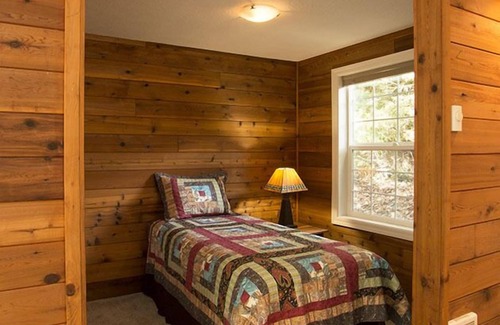 El extremo oeste de la casa cuenta con una sala de estar independiente con baño privado y cocina. Este espacio tiene una vista maravillosa del bosque y el arroyo, una entrada privada y una entrada común. Cuenta con techos estilo catedral y paredes de cedro. El amplio baño tiene una bañera y una ducha. La habitación tiene una cama queen size y una cama individual.
