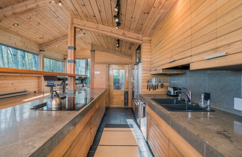 Una cocina gourmet viene equipada con todos los utensilios y utensilios de cocina que necesitará para preparar una excelente comida, incluida una vita-mix, una parrilla de fundición Vermont y un horno de convección. El patio de lajas es un lugar único para disfrutar de una comida con amigos mientras disfruta de la increíble vista. La casa está equipada con un sistema de sonido interior / exterior de 4 zonas para disfrutar de su música favorita mientras cocina y se entretiene en el patio.