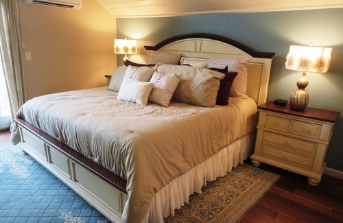 El primer dormitorio principal en el loft cuenta con una cama king, TV de pantalla plana de 39 pulgadas, ventilador de techo y baño privado. Las persianas entre el loft y la sala de estar a continuación permiten a los huéspedes elegir su propio grado de privacidad. El baño tiene lavabos para él y para ella y una bañera / ducha de tamaño completo con revestimiento de azulejos de metro y un piso de mármol travertino. A través de las puertas francesas, tendrá una terraza privada con un bistro perfecto para disfrutar de las vistas del atardecer con un brindis con champán.