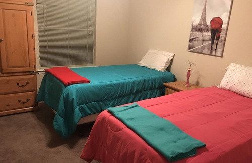 Muy limpio, bonito y acogedor hogar ubicado en el lado oeste de la ciudad. Toda la casa de dos pisos está disponible para los huéspedes. Arriba tiene dos dormitorios, uno con una cama de tamaño completo y el segundo con dos camas individuales. Un baño completo Jack-and-Jill. En la planta baja hay un dormitorio con una cama queen size, un baño completo con acceso desde el dormitorio y el pasillo. Una sala de estar muy acogedora con una gran pantalla de televisión, cable básico e internet. Una cocina con platos, utensilios y ollas y sartenes con una pequeña mesa. Un garaje doble. Lavadora y secadora en el garaje.