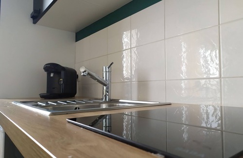 Cocina abierta muy bien equipada: Horno, nevera, lavavajillas, cafetera Tassimo, tetera, tostadora, cafetera de filtro, televisión.