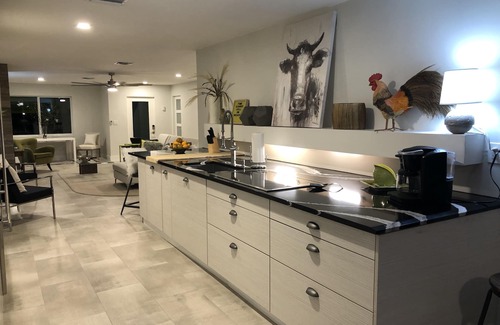Moderna casa de vacaciones de tres dormitorios y tres baños con patio privado y piscina climatizada. Gran salón acogedor con acogedora chimenea, cómodo sofá y áreas de descanso para tomar café, vino o un simple juego de ajedrez. Cocina estilo chef que conecta la sala de estar con el comedor que da a la piscina. Los controles deslizantes se abren completamente para conectar la sala de estar interior con la piscina y la cocina al aire libre (con refrigerador, estufa y parrilla de gas).