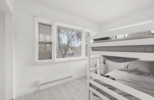 Enjoy a stylish experience at this centrally located place. This 2 bedroom unit is bright, clean, close to conveniences and in the downtown core. Perfect for long term stays. Located on a corner lot, in the downtown core, this unit is on the first floor and offers 2 bedrooms, dining area, full kitchen, living room and bathroom. The master bedroom features a 40" TV and a queen size bed, the second bedroom offers twin bunk beds.