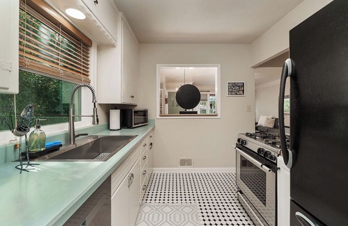 As you enter your home away from home, you will find an open floor plan to greet you. A large sectional couch for you to sit back and relax, while enjoying the Smart TV to stream your favorite apps. Disney+ is provided, for a variety of movies and shows! While relaxing, the rest of the family is prepping dinner in the kitchen with updated appliances and a gas burning stove for optimal cooking. A tasteful, eight seater, vintage table to surround yourself with family while enjoying the deliciously prepped meal. A beautifully restored chandelier lights up the whole space.