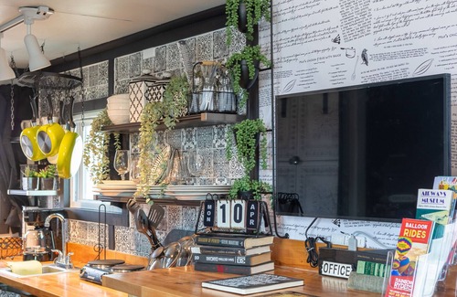 Upon entering this tiny house you will be greeted by a gothic Victorian feel living area combined with an equipped kitchenette that sets the tone for many unforgettable holiday memories. It's a cozy living space, and you can see the whole outside world from the cave.