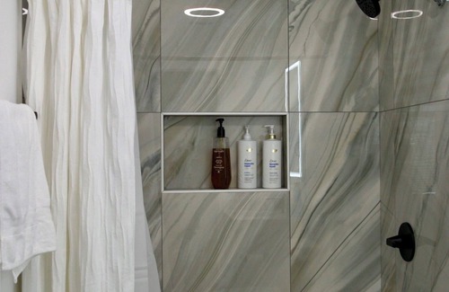 Bathrooms are stocked with basic toiletries and are equipped with Bluetooth-enabled speakers so that you can listen to your favorite music or podcast while taking a relaxing bath or shower.