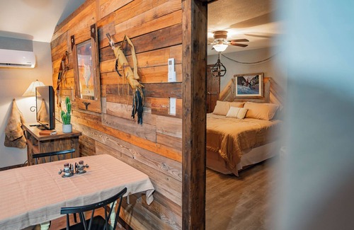 Great for couples, solo adventurers, and business travelers, or romantic getaway. "The Westerner" is located 7 min from Downtown Granbury. Luxury linens, king bed, large closet and bathroom. Tucked away in the woods with porch for watching birds and outdoor grill. We've just added a pull out couch bed to fit 2 more guests, making it an ideal spot for small families to stay.