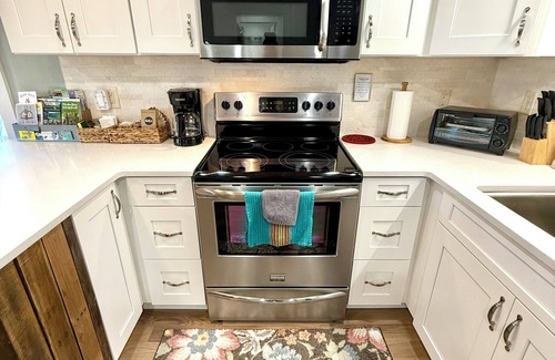 • Cocina totalmente equipada de acero inoxidable con refrigerador de tamaño completo, horno de 5 hornillas, lavavajillas, horno tostador, microondas, cafetera, licuadora, platos para 8, olla de barro, moldes para hornear,