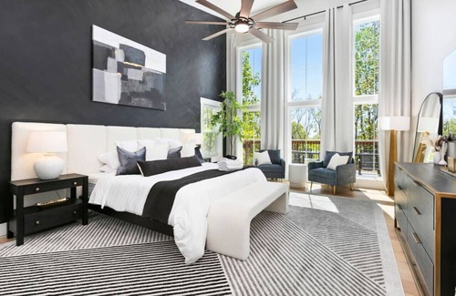✨ Retreat to one of the bedrooms for a good night's sleep, each with views of the woods and fully stocked with down pillows and comforters, and extra towels and linens. The huge master bedroom is on the main level and features a king-sized bed, perfect for a cozy Sunday brunch watching TV on the smart 4K 70” also with sound bar and subwoofer. The master bath is a luxurious mix of dolomite marble and tile featuring a double vanity and a spacious enclosed glass shower with multiple multi-level shower heads. And there is plenty of space in the walk-in closet for your stay.