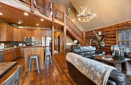 ¡Esta hermosa cabaña de madera nueva es un sueño para quedarse! Tiene capacidad para 14 con 5 camas queen y una litera de tamaño completo. Tendrás 4 habitaciones y un baño en cada nivel, aire acondicionado centralizado, TV por satélite, cocina completa, bañera de hidromasaje, encimeras de granito, mesa de póker personalizada y muchas más comodidades. Tanto la gran sala en el nivel principal como la sala familiar en el nivel inferior tienen chimeneas para acurrucarse y mirar televisión o disfrutar de una copa de vino. Cena en la terraza cubierta durante los meses cálidos o súbete a la bañera de hidromasaje para calentarte después de un día de esquí o motos de nieve. Deadwood está a solo 8 km.