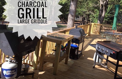 Al otro lado de la parte trasera de la casa hay una cubierta muy amplia. Mucho espacio para relajarse y ver el lago o entretenerse y cocinar con familiares y amigos. ¡Hay 2 parrillas, una de carbón y una parrilla de gas, así como una gran plancha de gas que hace un sabroso salteado o desayuno por la mañana!