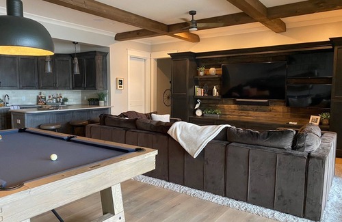 Gran sala de nivel inferior con bar, mesa de billar y 3 medios de TV