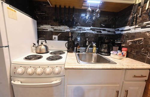 Cocina y sala de estar son concepto abierto, con sofá-cama, TV de 42 pulgadas con la red del plato y un montón de asientos. La cocina está totalmente equipada para cocinar cualquier cosa que no requiere un horno. Incluye nevera, lavavajillas, microondas y 2 quemadores.