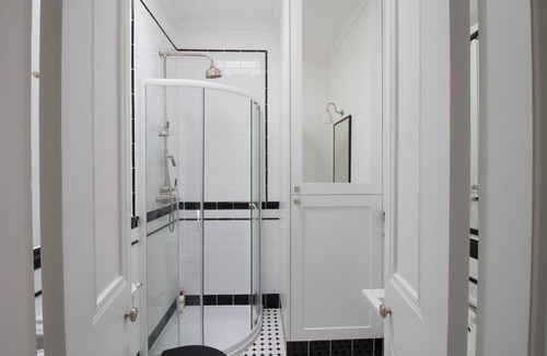 El dormitorio principal tiene una cómoda cama king-size y un armario empotrado muy grande con una cómoda. El segundo dormitorio tiene una cama de invitados que se puede convertir en una gran cama king size o, previa solicitud, dos camas individuales, según sus necesidades. Un armario de doble puerta está a su disposición. Se proporcionan ropa de cama y toallas. Hay dos baños decorados en un estilo art deco tradicional. El baño en suite tiene un mezclador de baño con ducha de hidromasaje y el segundo cuarto de baño también está equipado con una ducha de hidromasaje. Ambos tienen el beneficio de calefacción por suelo radiante con control termostático. Se proporcionan artículos de tocador como jabón, gel de ducha, champú y acondicionador, así como un secador de pelo.