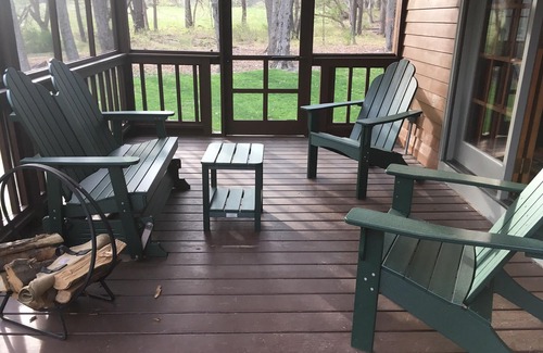 Publicar y vigilar a casa con estufa de leña y dos chimeneas de leña. Envuelva alrededor de la cubierta con balcón y proyectado en el porche con vistas al arroyo estacional. El piso principal tiene cocina, comedor, sala de estar, baño completo y estudio que se convierte en dormitorio privado. El segundo piso tiene dos dormitorios y otro baño.