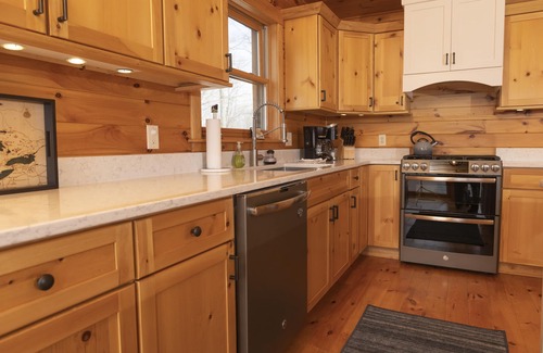 Al entrar en la casa, lo recibe una gran sala de barro de nivel inferior con un montón de espacio de almacenamiento para sus pertenencias, y medio baño. Sube por la escalera hacia la vida espaciosa y abierta del nivel principal y es probable que las VISTAS se lleven la respiración. La cabina cuenta con un estilo tradicional de marco en A, con una sensación de alojamiento confortable. La sala de estar abierta cuenta con un gran techo abovedado con ventanas de piso a techo y una chimenea de piedra natural, cocina de concepto abierto y comedor. Una lavandería dedicada se encuentra fuera de la sala de estar principal. La suite principal, con un gran baño principal y una ducha a ras de suelo, junto con los dos dormitorios de invitados y otro baño completo, también se encuentran en el nivel principal. El área superior del loft continúa con increíbles VISTAS del agua azul y se configura con un nuevo televisor inteligente de 65 pulgadas, amplios asientos para una noche de películas o juegos, y es un área para dormir adicional con una cama tamaño queen / full.