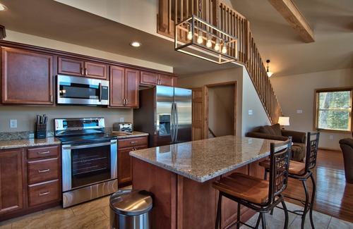 Justo más allá de la cocina, puede salir a la plataforma de 400 pies cuadrados que tiene vistas completas y sin obstrucciones del lago. ¡Allí puede sentarse en una silla de salón y respirar el aire fresco o relajarse leyendo un libro! ¡Un vuelo arriba hay otros dos dormitorios principales con baños privados y un área de loft para niños que tiene capacidad para 6 personas!