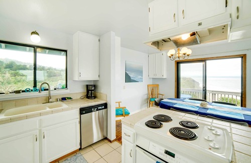 Admire las vistas al océano desde la pared de ventanas que rodean el interior de esta casa de 1.398 pies cuadrados. Ya sea que esté descansando en la sala de estar o preparando una deliciosa comida casera en la cocina totalmente equipada, no se perderá ver esas aguas azules brillando a la luz del sol.