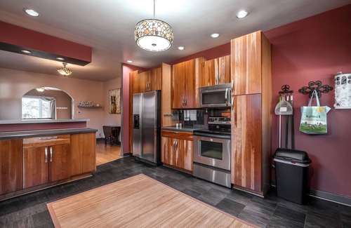 La cocina tiene todo lo que necesitas para hacer que esta casa se sienta como un hogar. Cafetera Keurig, todas las ollas / sartenes / artículos para hornear / cubiertos / vajilla incluidos. Gran nevera, cocina eléctrica, horno, y lavavajillas.