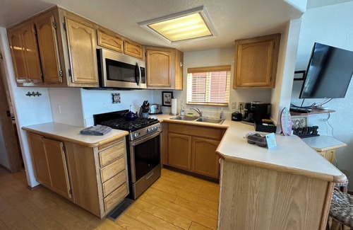 Prepara una comida casera en la cocina, equipada con horno, placa de cocina y frigorífico, además de cafetera y tetera, microondas y utensilios de cocina. El cuarto de baño incluye un secador de pelo y toallas. Otras comodidades incluyen ropa de cama, una tabla de planchar, calefacción y una mesa de comedor.