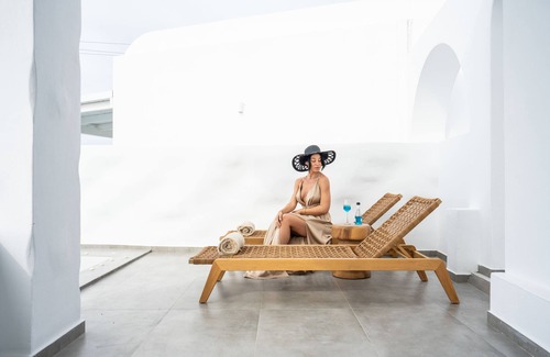 En el exterior hay un patio privado y un balcón con vistas al mar Egeo y la más famosa puesta de sol, con una zona de comedor para 10 personas, para disfrutar de cenas al aire libre. Además, hay una piscina de spa al aire libre privado de hidromasaje (para 5 personas) y un uso común con piscina, lo que combinado con la vista al mar perfecto, te mantendrá allí todo el día. El lujo se combina con la máxima privacidad ofrece una estancia inolvidable y una experiencia única.