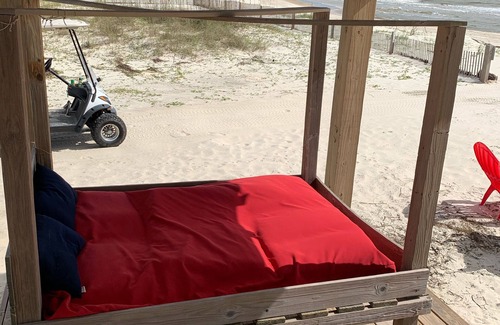 Cabaña de playa privada en el lado del golfo de la propiedad con una cama, mesa de picnic y sillones.