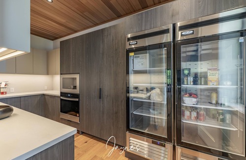 Around the corner a wet bar area offers two wine fridges.