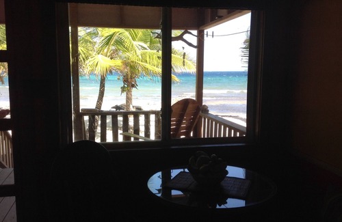 Esta casa frente a la playa no es grande, pero tiene un plan de piso abierto considerable que es perfecto para una pareja en una escapada romántica isla. Situado en una playa privada repleta de palmeras de coco de rodamiento y un viento del Este prevalece el comercio, la Jawfish Beach House Purple ha sido llamado el mejor alquiler de vacaciones para parejas por numerosos huéspedes de otros sitios web de alquiler de vacaciones. La casa ha sido recientemente gut-renovado y está como nuevo. El área de cocina, comedor, sala de estar / zona de lectura y dormitorio están todos bien definida por contadores únicos, un hondureño estantería de madera de encargo y un armario. La cocina cuenta con todos los nuevos electrodomésticos de acero inoxidable (sin lavavajillas aunque) y un fregadero profundo hundido en una encimera península centavo único. Hay 20 pies de 4 pies de alto ventanas en el frente y los lados de la casa (15 pies de que se vean directamente sobre la playa con el mar Caribe y las montañas más allá). Es realmente increíble ver.