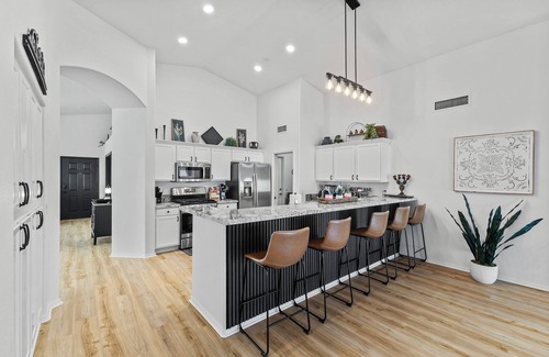 Just 2 miles to P83 dining and shopping, 101 interchange and the Peoria Sports complex, this dessert Oasis boasts a large pool, bbq, fire table and a put-put golf right in your back yard. Inside enjoy the big screen THEATER EXPERIENCE in the theater room. Enjoy a workout in the gym, then a nice dinner in the gourmet kitchen, with granite counter tops and bar. All designed for comfort. Dedicated work space for the workaholic. The home is big enough to bring the team, 4 bedroom 2 bath sleeps 10. All one level for easy access, located in quiet arrowhead neighborhood. Easy access to everything. You have a TV in every room, books, WIFI, ceiling fans in every room and everything you need to cook and bake. Central AC, and portable fans. Plenty of parking.