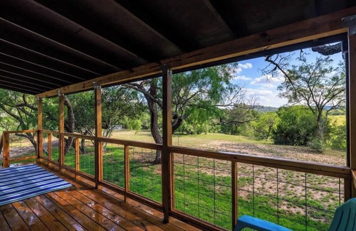 Nestled amidst the serene beauty of the Texas Hill Country, Paintbrush Cottage stands as one of six charming accommodations on this picturesque property. The cottage showcases vaulted ceilings and a spacious front porch, offering an ideal spot to savor morning coffee while admiring the pastoral views of neighboring ranches featuring goats, sheep, donkeys, and llamas.