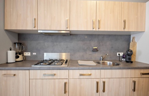 La cocina está dotada de placa de cocina, microondas y cafetera y tetera.