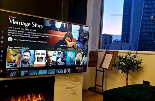 The living room is bright, boasting stunning views of the stadium and the surrounding architecture. It includes a flat-screen TV with Netflix and an electric fireplace that creates a welcoming atmosphere.