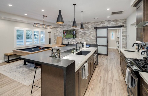 • Nuestra casa "Resort" ha sido recientemente remodelada y actualizada con las mejores comodidades. Hermosa cocina abierta y sala familiar / bar con mesa de comedor de madera convertible en una mesa de billar con fieltro negro. Los televisores de alta definición se encuentran en la cocina, el comedor, las habitaciones familiares y también en el patio para no perderse un momento de su deporte favorito. Sonos Speakers con opciones WIFI habilitadas para la mejor producción de sonido en todas partes