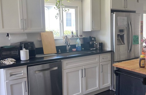 Our house features three bedrooms: a large master, an office with queen-sized bed, and a vibrant kids' room with bunkbeds. Relax in our large open living room, kitchen and dining room. Additional artist's studio in the backyard among citrus trees, native plants and a custom-built Japanese soaking tub. And a long, private driveway that can accommodate up to three cars.